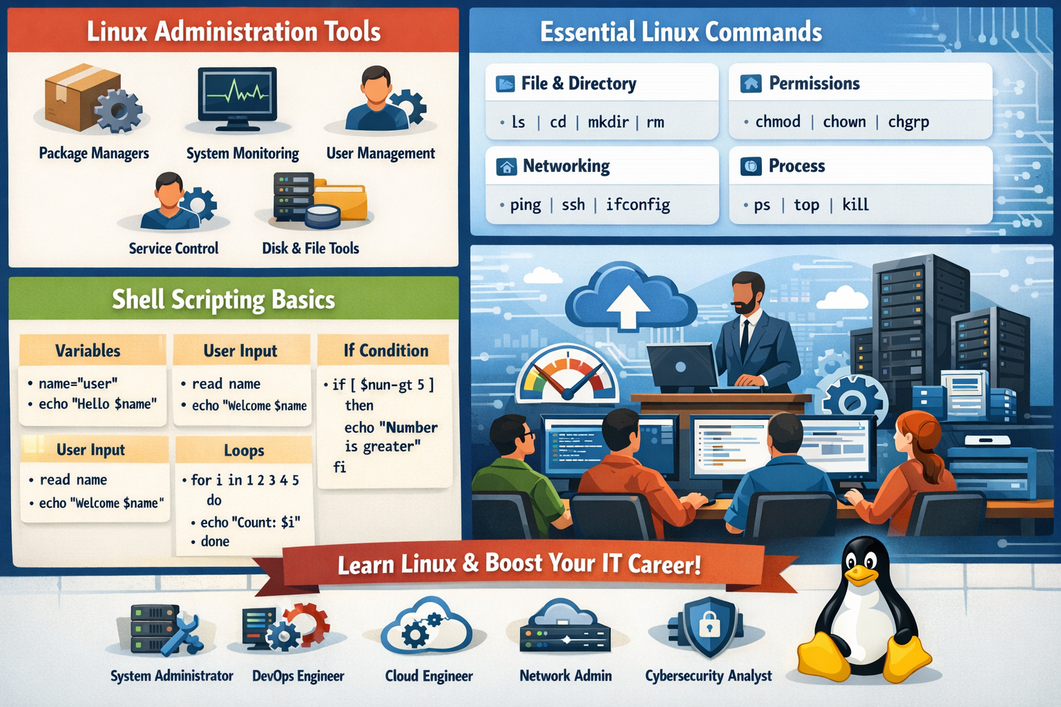 Linux is one of the most powerful and widely used operating systems in the world. From web servers and cloud platforms to cybersecurity and DevOps environments, Linux plays a critical role in modern IT infrastructure. In this blog, we will explore three essential areas every beginner and aspiring system administrator must know: Linux Administration Tools, Important Linux Commands, and Shell Scripting Basics.