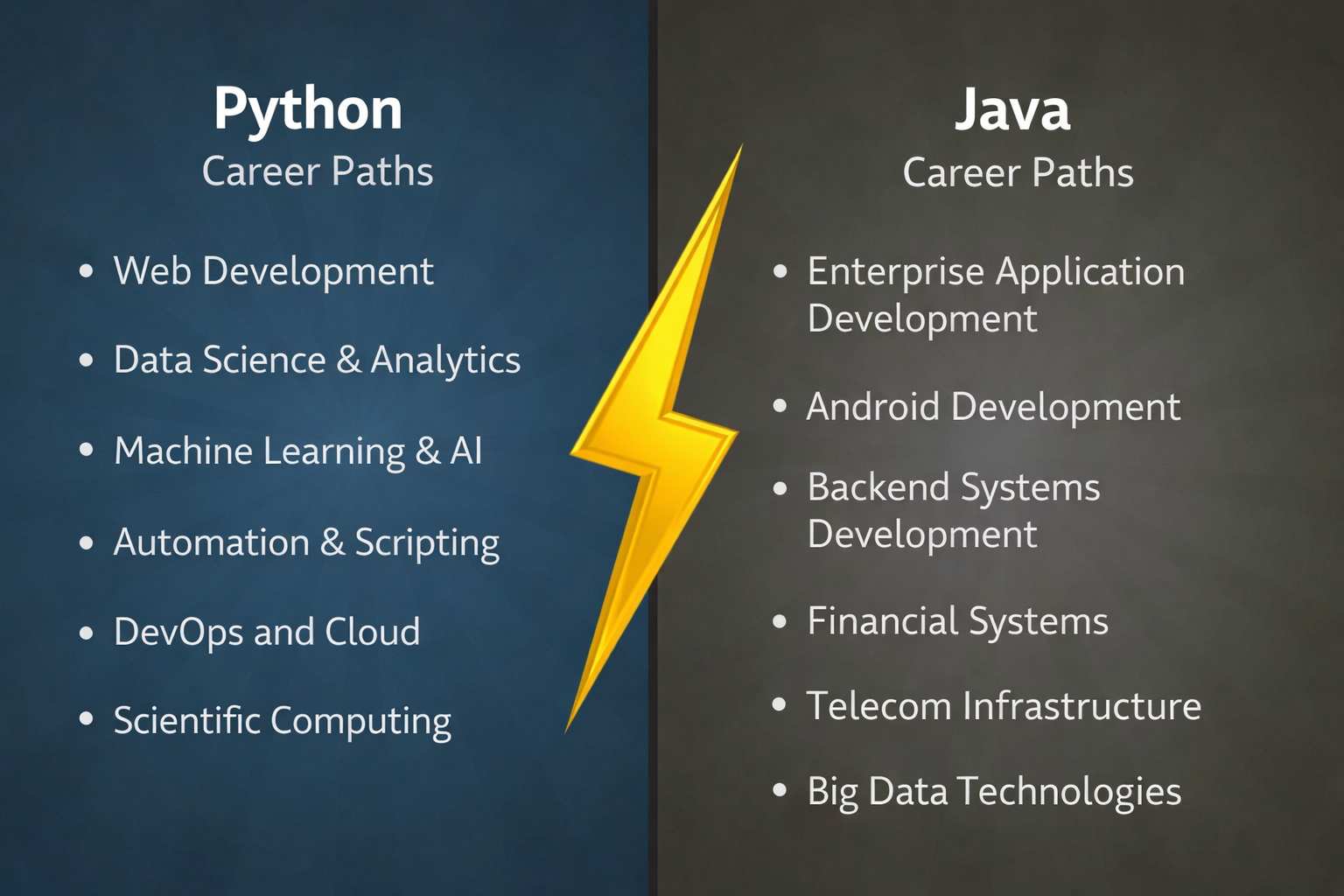 Java offers enterprise stability, deeper specialization, and long-term career security in sectors that won't rewrite their systems anytime soon. It's the choice if you're willing to invest time in mastering complex concepts for stable, long-term careers.