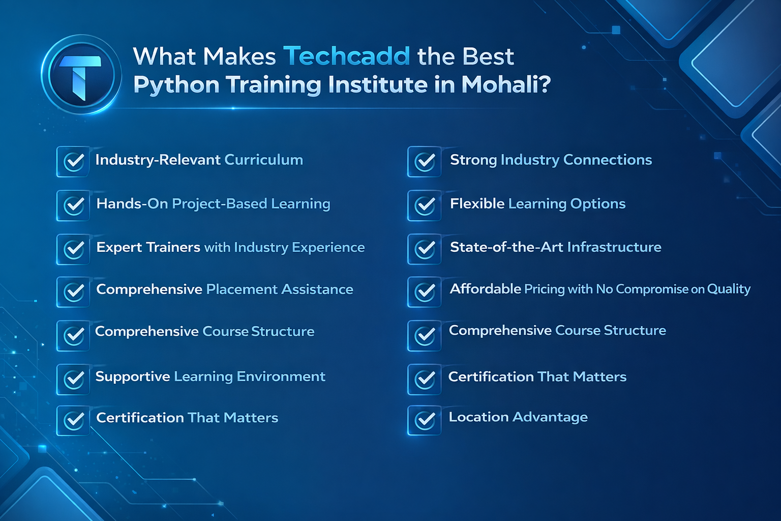 If you're serious about a career in Python development, if you want the best training Mohali has to offer, if you want to join a community of successful professionals, then Techcadd is your answer.